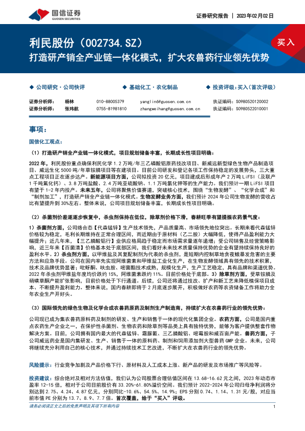 2022年,利民股份重点确保利民化学1.2万吨/年三乙磷酸铝原药技改项目、新威远新型绿色生物产品制造项目、威远生化5000吨/年草铵膦项目等在建项目。目前公司研发和登记各项工作保持稳定的发展势头,三大重点工程项目正在逐步达产。新能源项目方面,公司拟投资20亿元,项目建成后形成年产2万吨LiFSI(及联产1千吨氟化钙)、3.8万吨盐酸、2.4万吨亚硫酸钠、1.1万吨氯化钾等的生产能力。我们预计一期LiFSI项目有望于1-2年内投产。未来五年,公司将聚焦价值赛道,突破核心技术,围绕“生物发酵”、“化学合成”和“制剂加工”,打造研产销全产业链一体化模式。生物发酵业务方面,我们预计2024年公司生物发酵的营收占比有望提升到30%左右。整体来说,公司项目规划储备丰富,长期成长性项目明确。