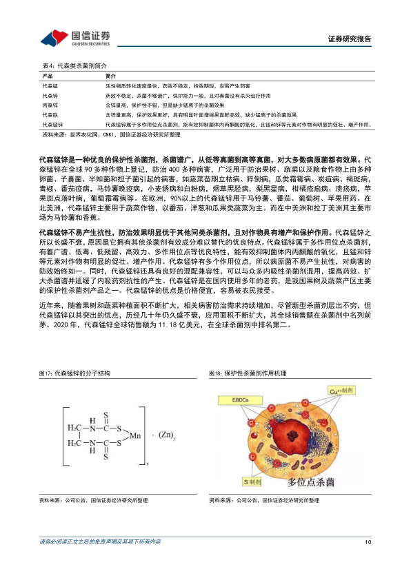 杀菌剂分为保护性与内吸性,其中多作用位点保护性杀菌剂(如硫磺、铜制剂、百菌清、代森锰锌)因不易产生抗药性而生命力旺盛。代森锰锌作为一种优良的保护性杀菌剂,杀菌谱广、不易产生抗性、对作物有促壮增产作用,在全球90多种作物上登记,防治400多种病害。2020年,代森锰锌全球销售额达11.18亿美元,在全球杀菌剂中排名第二。全球代森锰锌产能主要集中在印度(15万吨)和中国(6.5万吨),公司拥有4.5万吨/年产能。公司在原材料采购成本上具有优势,且络合态代森锰锌生产技术国际领先,产品质量高,生产成本节约1000元/吨。2021年,公司耗资2000万美元购买科迪华中国代森锰锌商业资产,包含“大生”品牌,进一步提升了规模优势和品牌影响力。