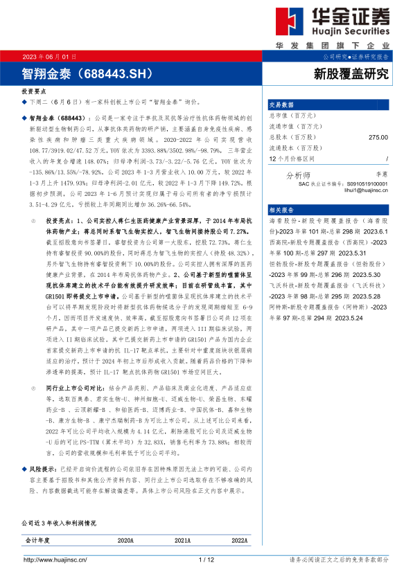 智翔金泰(688443):公司是一家专注于单抗及双抗等治疗性抗体药物领域的创新驱动型生物制药公司,从事抗体类药物的研产销,主要涵盖自身免疫性疾病、感染性疾病和肿瘤三类重大疾病领域。2020-2022年公司实现营收108.77/3919.02/47.52万元,YOY依次为3393.88%/3502.98%/-98.79%,三年营业收入的年复合增速148.07%;归母净利润-3.73/-3.22/-5.76亿元,YOY依次为-135.86%/13.55%/-78.92%。公司2023年1-3月营业收入10.00万元,较2022年1-3月上升1479.93%;归母净利润-2.01亿元,较2022年1-3月下降149.72%。根据初步预测,公司2023年1-6月预计实现归属于母公司所有者的净亏损预计3.51-4.29亿元,亏损较上年同期同比增加36.26%-66.54%。