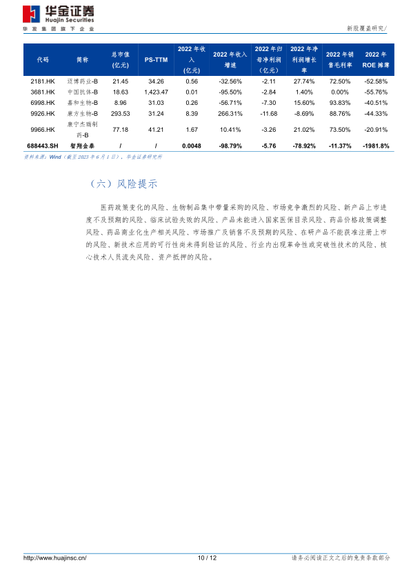 医药政策变化的风险、生物制品集中带量采购的风险、市场竞争激烈的风险、新产品上市进度不及预期的风险、临床试验失败的风险等。