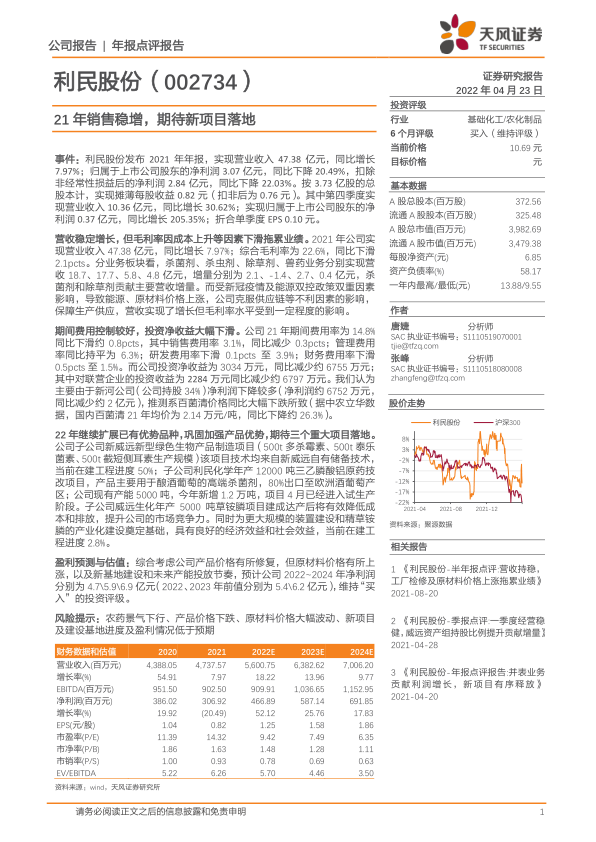 事件:利民股份发布2021年年报,实现营业收入47.38亿元,同比增长7.97%;归属于上市公司股东的净利润3.07亿元,同比下降20.49%,扣除非经常性损益后的净利润2.84亿元,同比下降22.03%。按3.73亿股的总股本计,实现摊薄每股收益0.82元(扣非后为0.76元)。其中第四季度实现营业收入10.36亿元,同比增长30.62%;实现归属于上市公司股东的净利润0.37亿元,同比增长205.35%;折合单季度EPS0.10元。