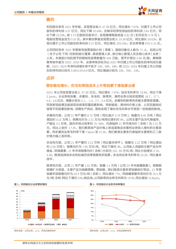 利民股份2021年实现营业收入47.38亿元,同比增长7.97%;归属于上市公司股东的净利润为3.07亿元,同比下降20.49%。扣除非经常性损益后净利润为2.84亿元,同比下降22.03%。第四季度表现亮眼,营收同比增长30.62%至10.36亿元,归母净利润同比增长205.35%至0.37亿元。公司同时发布2022年限制性股票激励计划,拟授予436万股,激励对象71人,设定2022-2024年净利润增长率不低于10%、38%、58%的业绩考核目标。