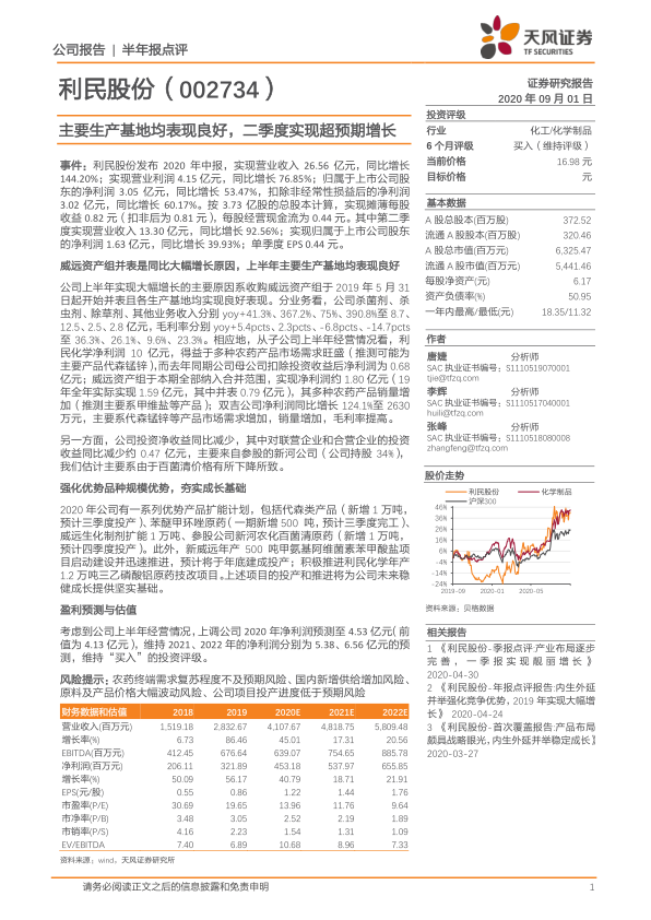 利民股份2020年中报业绩表现亮眼,主要得益于威远资产组的并表和各生产基地的良好表现。公司通过积极的扩能计划和新项目建设,有望进一步巩固市场地位,实现稳健成长。考虑到公司上半年的良好经营情况,分析师上调了公司2020年的盈利预测,并维持“买入”的投资评级。然而,投资者也应关注农药终端需求、市场竞争、价格波动以及项目投产进度等风险因素。