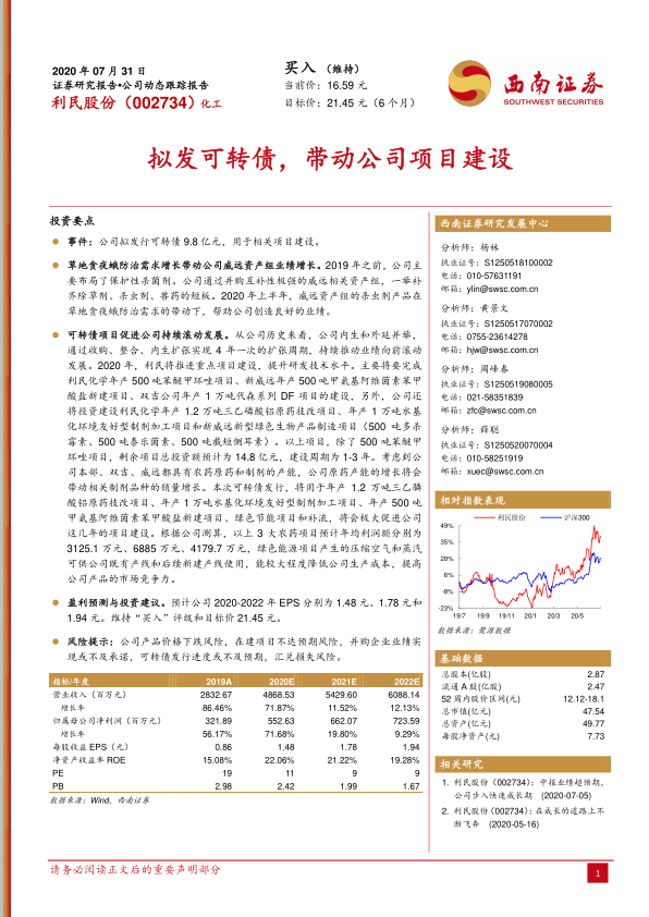 本报告对利民股份的投资价值进行了分析,认为公司通过发行可转债和受益于市场需求增长,有望实现持续的业绩增长。维持“买入”评级和目标价21.45元。