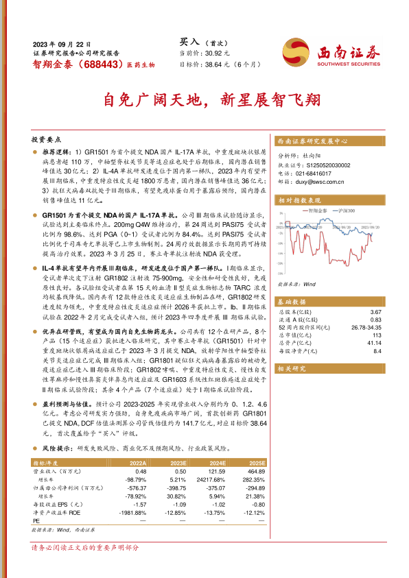 盈利预测与估值。预计公司2023-2025年实现营业收入分别约为0、1.2、4.6亿元。考虑公司研发实力强劲,自身免疫疾病市场广阔,首款创新药GR1801已提交NDA,DCF估值法测算公司管线估值约为141.7亿元,对应目标价38.64元,首次覆盖给予“买入”评级。