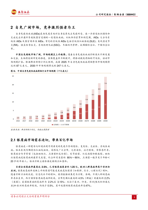 报告深入分析了中国自身免疫性疾病(包括银屑病、系统性红斑狼疮、特应性皮炎)和狂犬病被动免疫市场的巨大未满足需求和快速增长潜力。例如,中国银屑病患者人数预计2030年将达到约685万人,特应性皮炎患者人数预计2030年增至8170万人,狂犬病病毒暴露患者每年约4000万人。这些庞大的患者群体和不断提升的生物药渗透率,为智翔金泰的核心产品提供了广阔的市场空间。通过DCF估值法测算,公司核心管线产品GR1501、GR1802、GR1801的销售峰值分别预计达30.3亿元、36.2亿元和11.6亿元,总估值约为141.7亿元,对应目标价38.64元,首次覆盖给予“买入”评级,凸显了其显著的估值提升潜力。