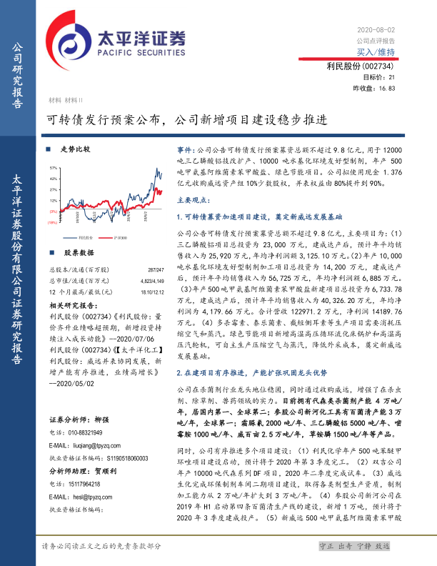 利民股份发布可转债发行预案,募资不超过9.8亿元,用于三乙膦酸铝技改扩产、水基化环境友好型制剂、甲氨基阿维菌素苯甲酸盐等项目,以及绿色节能项目。