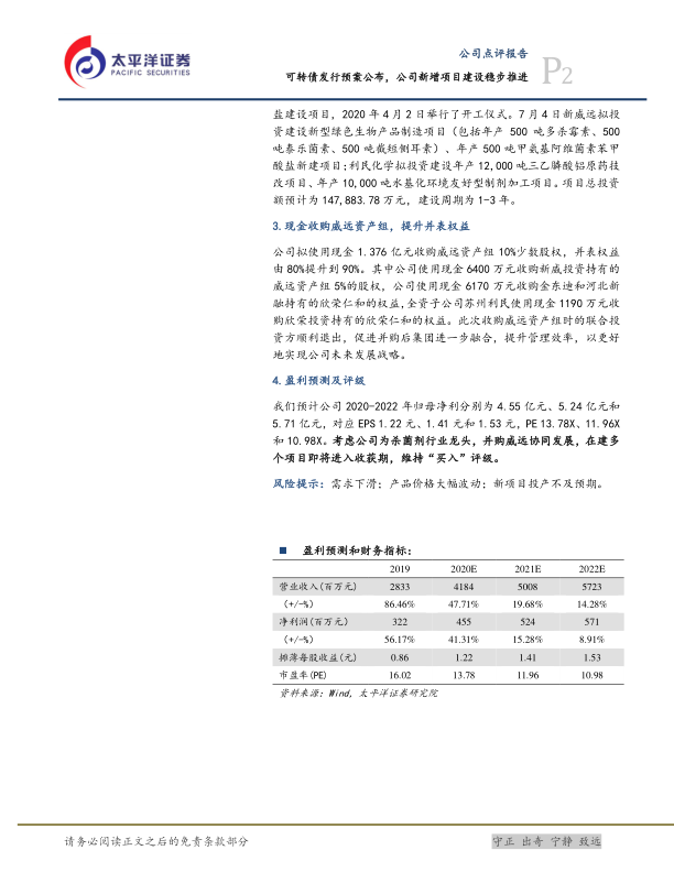 预计公司2020-2022年归母净利分别为4.55亿元、5.24亿元和5.71亿元,对应EPS分别为1.22元、1.41元和1.53元,PE分别为13.78X、11.96X和10.98X。维持“买入”评级。