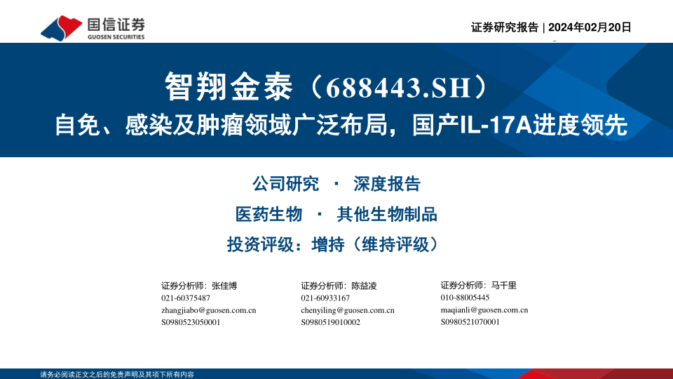智翔金泰作为一家创新驱动的生物制药企业,在自身免疫、感染和肿瘤三大治疗领域进行了广泛布局。公司核心产品GR1501(赛立奇单抗)作为国内首个申报上市的国产抗IL-17A单抗,在中重度斑块状银屑病和中轴型脊柱关节炎适应症上均表现出优异的临床数据和领先的国内进度,预计分别于2024年上半年和2025年第三季度获批上市,有望贡献显著营收。同时,GR1801作为全球首个进入临床阶段的抗狂犬病病毒G蛋白双抗产品,预计于2025年第四季度实现国内商业化,将进一步完善狂犬病被动免疫策略。此外,GR1802(IL-4Rα单抗)、GR1603(IFNAR1抗体)以及肿瘤领域的CD3xBCMA和CD3xCD123双抗等管线也进展顺利,为公司提供了多元化的增长潜力。尽管公司目前仍处于亏损阶段,但充沛的在手现金和持续的研发投入为其未来发展提供了坚实基础。基于对核心产品商业化前景的分析,公司估值区间为35.37~37.99元,维持“增持”评级。