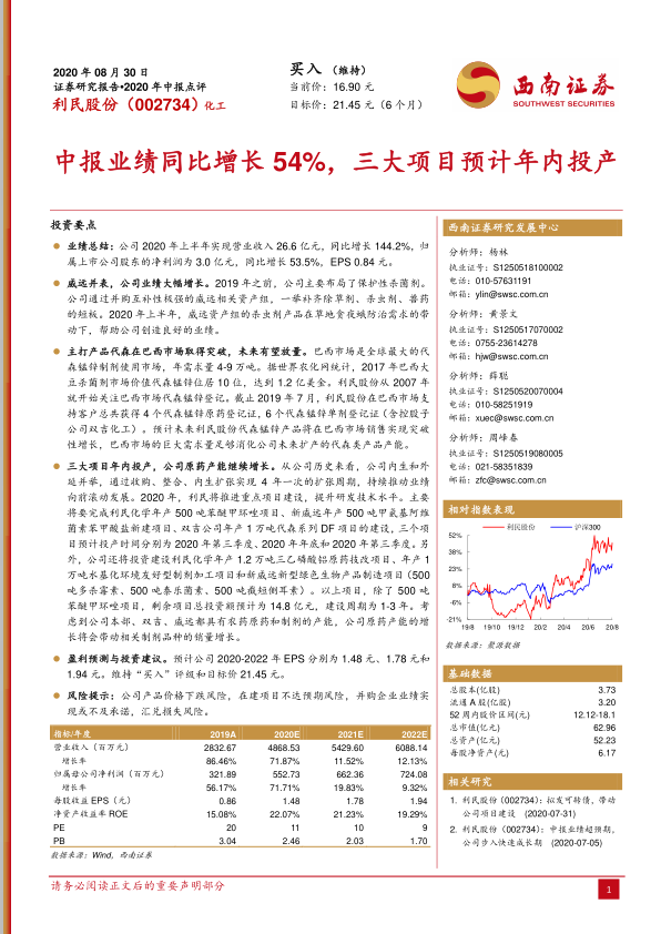 本报告对利民股份2020年中报进行了分析,指出公司通过并购威远资产组,业绩大幅增长;主打产品代森在巴西市场取得突破,未来有望放量;三大项目预计年内投产,公司原药产能继续增长。预计公司2020-2022年EPS分别为1.48元、1.78元和1.94元,维持“买入”评级和目标价21.45元。