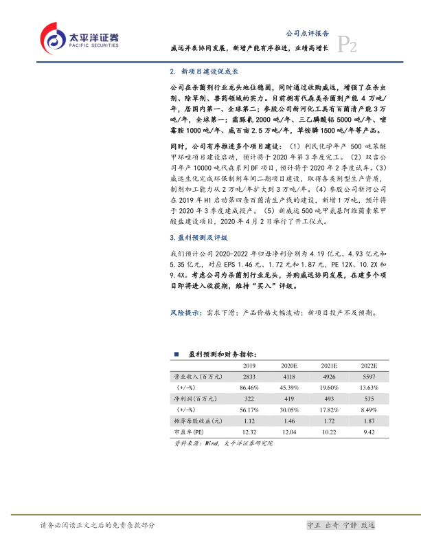 2019年业绩回顾与增长动因 2019年,利民股份实现营业收入28.33亿元,同比增长86.46%;归属于母公司股东的净利润3.22亿元,同比增长56.17%。业绩高增长主要源于以下三个核心驱动因素: