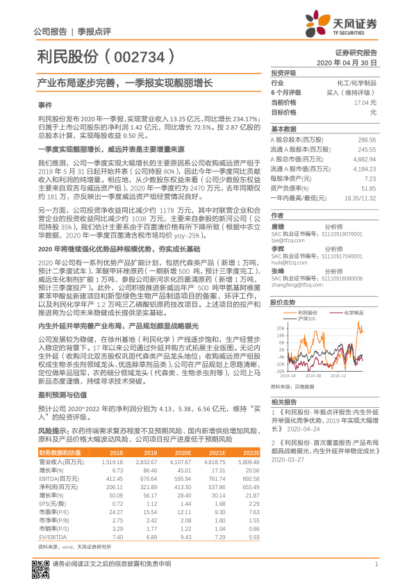 利民股份2020年一季报业绩亮眼,主要受益于威远资产组的并表。公司通过内生外延并举,不断完善产业布局,尤其在优势产品扩能方面积极推进,为未来稳健成长奠定基础。报告维持“买入”的投资评级,但同时也提示了农药终端需求、新增供给、价格波动以及项目投产进度等风险。投资者应关注公司未来项目投产进度和市场需求变化,谨慎决策。