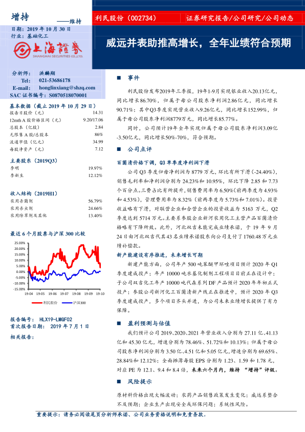 本报告分析了利民股份2019年三季报,指出公司业绩增长符合预期,主要受益于威远生化的并表。虽然Q3单季度利润有所下滑,但公司多个新建产能项目正在有序推进,为未来增长提供保障。维持对利民股份的“增持”评级,并提示了相关风险。