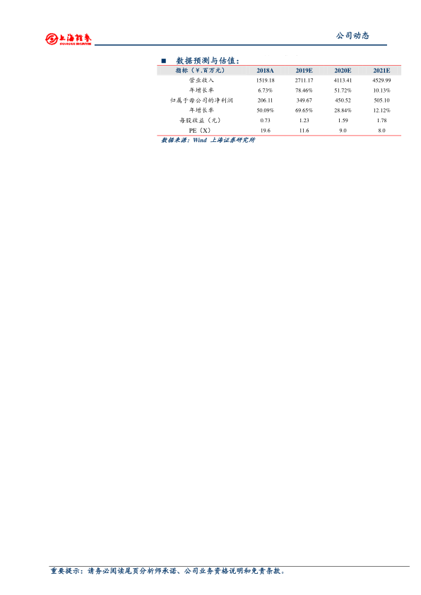 预计公司2019-2021年营业收入分别为27.11亿、41.13亿和45.30亿元,增速分别为78.46%、51.72%和10.13%;归母净利润分别为3.50亿、4.51亿和5.05亿元,增速分别为69.65%、28.84%和12.12%;对应EPS分别为1.23、1.59和1.78元,对应PE为12.1、9.4和8.4倍。维持“增持”评级。