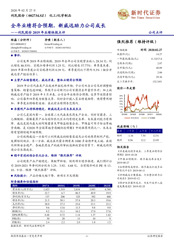 利民股份2019年业绩表现强劲,营业收入和归母净利润均实现大幅增长,这主要得益于核心产品的稳定销售以及威远资产组的成功并表。公司在杀菌剂领域保持市场领先地位,并通过威远并购获得了新的增长动力和战略资源,尤其是在阿维菌素及甲维盐市场。尽管第四季度业绩受季节性因素影响略有波动,但整体符合预期。展望未来,公司现有产品产销稳定,新项目稳步推进,且威远在环保趋严背景下的土地资源和协同效应将为公司带来长期成长。基于此,分析师维持了“强烈推荐”的投资评级,并预计公司未来几年将保持稳健的盈利增长。