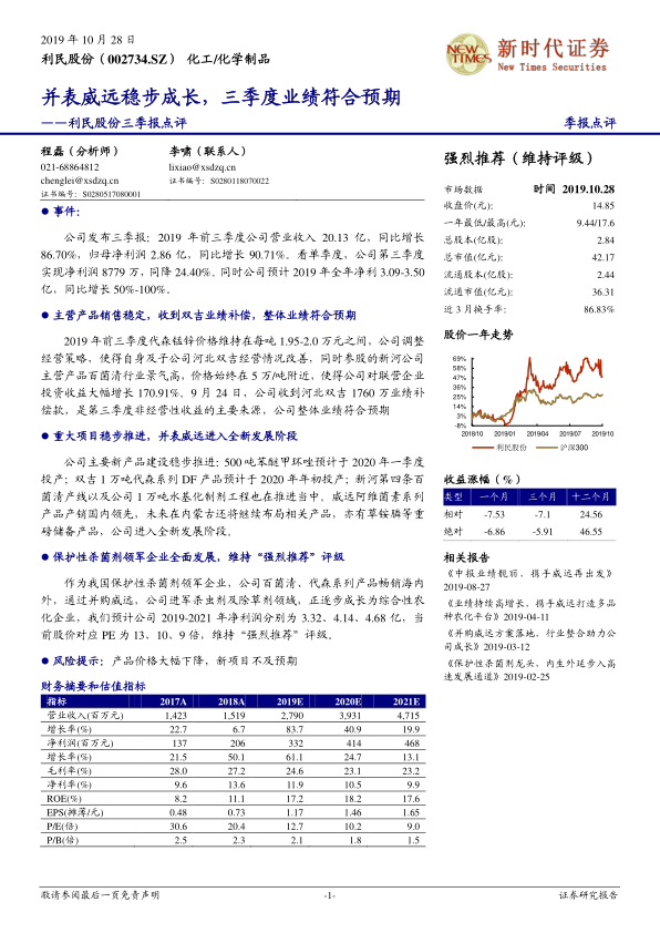 利民股份在2019年前三季度展现出强劲的业绩增长势头,营业收入和归母净利润分别同比增长86.70%和90.71%,这主要得益于并表威远带来的规模效应、主营产品销售的稳定以及联营企业投资收益的大幅增长。尽管第三季度单季净利润同比下降24.40%,但全年净利润预计仍将实现50%-100%的增长,且收到的河北双吉业绩补偿款有效支撑了整体业绩。公司在保护性杀菌剂领域的领先地位稳固,同时通过并购威远成功拓展至杀虫剂和除草剂市场,逐步构建起综合性农化平台。多个新项目如苯醚甲环唑、代森系列DF产品、百菌清产线和水基化制剂工程的稳步推进,为公司未来发展注入了强劲的内生动力。分析师维持“强烈推荐”评级,并预测公司未来三年净利润将持续增长,对应较低的P/E估值,显示出良好的投资价值。投资者需关注产品价格波动及新项目进展不及预期的风险。