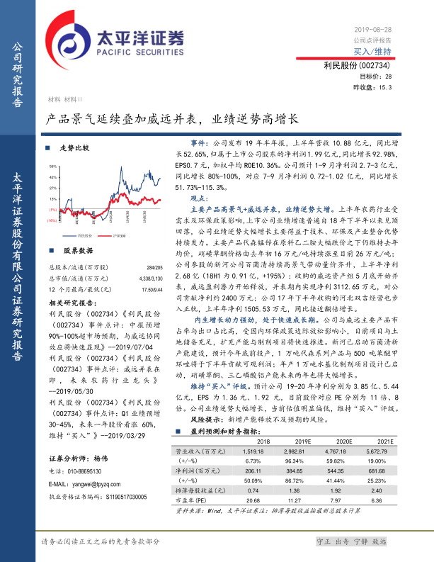 基于公司强劲的内生增长动力和未来发展潜力,太平洋证券维持对利民股份“买入”评级,并预测公司未来两年净利润将持续增长。