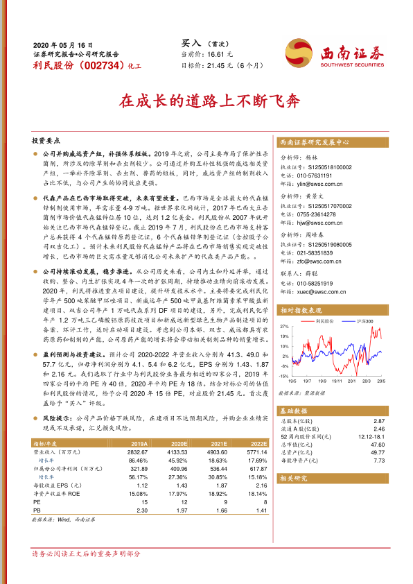 通过选取扬农化工、安道麦A、利尔化学、中旗股份等四家业务相近的可比公司进行估值分析,2019年可比公司平均PE为40倍,2020年平均PE为18倍。综合考虑对标公司估值和利民股份自身情况,给予公司2020年15倍PE,对应目标股价21.45元。首次覆盖给予“买入”评级。