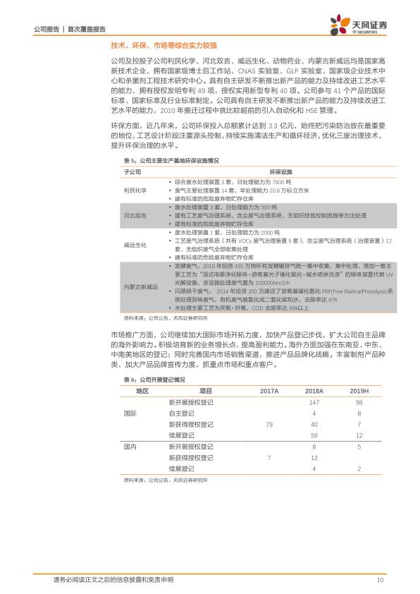 公司及控股子公司利民化学、河北双吉、威远生化、动物药业、内蒙古新威远均为国家高新技术企业,拥有国家级博士后工作站、CNAS实验室、GLP实验室、国家级企业技术中心和杀菌剂工程技术研究中心。公司具备自主研发和持续改进工艺水平的能力,拥有49项授权发明专利和40项授权实用新型专利,并参与了41个产品的国际、国家及行业标准制定。在环保方面,公司累计投入3.3亿元,注重源头控制,实施清洁生产和循环经济,优化三废治理技术,提升环保治理水平。
