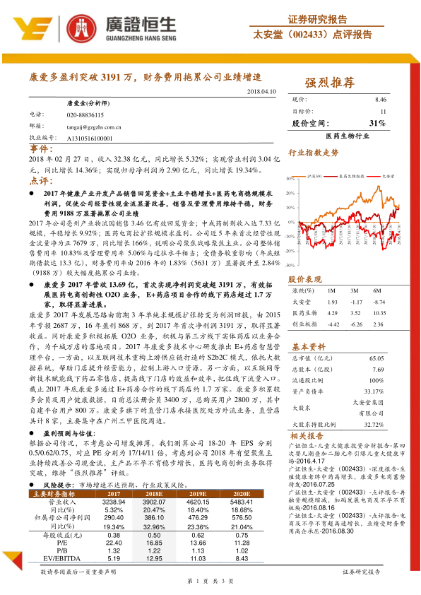 报告维持对太安堂的“强烈推荐”评级,并设定目标价11元,预估股价空间为31%。这一评级主要基于以下判断:公司2018年有望持续聚焦主业,进一步改善现金流状况;主产品不孕不育系列预计将保持稳步增长;医药电商康爱多的创新业务模式已取得突破性进展,未来增长潜力巨大。