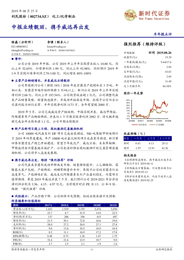 利民股份2019年上半年实现营业收入10.88亿元,同比增长52.65%;归母净利润1.99亿元,同比大幅增长92.98%。公司预计1-9月归母净利润将达到2.70-3.00亿元,同比增长80%-100%,显示出强劲的业绩增长势头。此次业绩靓丽主要得益于主营产品销售畅旺以及威远资产组的成功并表,威远仅并表一个月即贡献净利润2982万元,预计将超额完成全年业绩承诺。