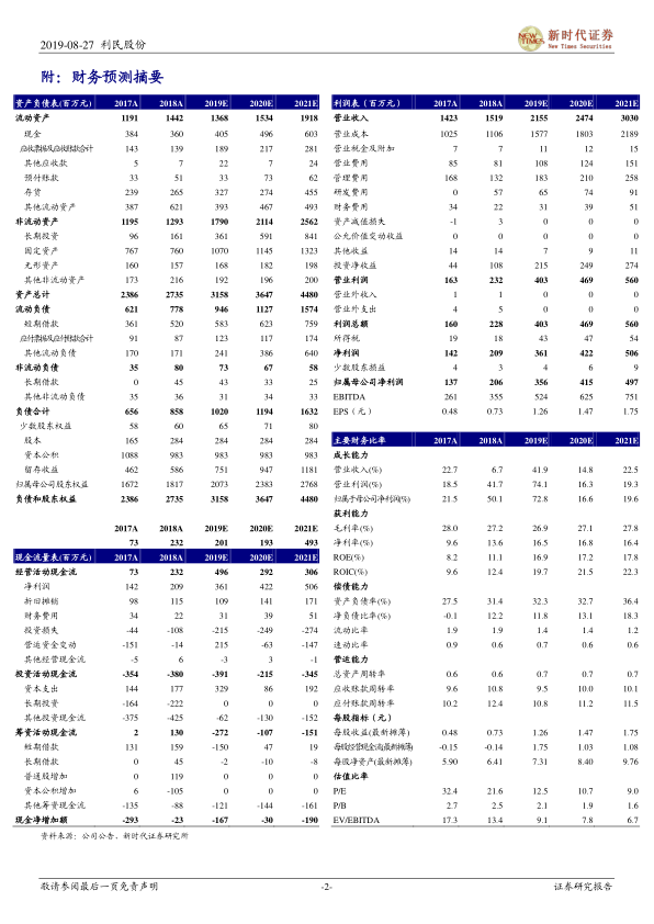 考虑威远2019年并表7个月,新时代证券预计公司2019-2021年合并后净利润分别为3.56亿元、4.15亿元和4.97亿元。当前股价对应PE分别为13倍、11倍和9倍。基于此,维持“强烈推荐”评级。