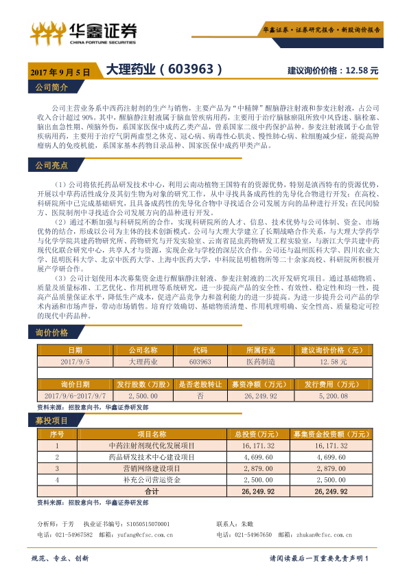 本报告对大理药业的新股询价进行了分析,基于公司在中西药注射剂领域的市场地位、核心产品的竞争优势、以及在研发和产学研合作方面的潜力,建议询价价格为12.58元。