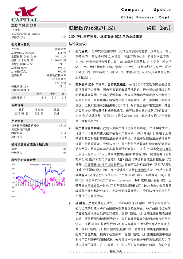 国产替代有望加速:我们认为国产替代进程也将加速,2/14国家发布了《进口不予免税的重大技术装备和产品目录(2025年版)》新增了正电子发射及X射线计算机断层成像扫描系统、单光子发射断层成像扫描系统等生物医疗装备,我们认为3/1日执行后国产设备性价比的优势将会更加凸显。而公司高端产品具有很强的竞争力:(1)公司是全球仅有的三家可以生产5.0T以上的高端核磁共振影像设备(MR)的设备商(另外两家为GE医疗和西门子医疗);(2)X射线计算机断层成像扫描设备(CT)设备也全面覆盖16排至320排产品,高端产品对标西门子、GE及飞利浦;(3)分子影像系统(MI)也已陆续推出多款行业领先产品,包括行业首款具有4D全身动态扫描的PRT/CT产品uEXPLORER,业界最高190ps量级TOF分辨率PET/CT产品uMI Panorama;(4)放射治疗设备(RT)也已开发出行业首款一体化CT引导直线加速器uRT-linac506c。公司各领域设备全面对标行业龙头,产品性能极具竞争力,我们认为公司将在国产替代的进程中受益。
