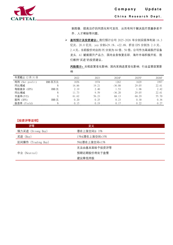 盈利预计及投资建议:我们预计公司2025-2026年分别实现净利润16.3亿元、20.0亿元,yoy分别+29.1%、+22.6%,折合EPS分别为2.0元、2.4元。当前股价对应的PE分别为68倍、56倍。公司作为高端医疗设备龙头,AI赋能提升产品力,国内业务恢复在即,海外市场积极开拓,我们维持“买进”的投资建议。
