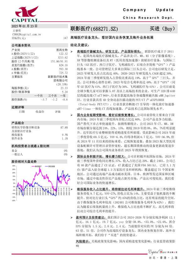联影医疗作为中国高端医疗设备领域的领军企业,凭借其强大的研发实力和国际领先的产品技术,在全球市场中占据重要地位。尽管2024年前三季度国内业务受行业整顿影响出现短期下滑,但随着国内政策利好和设备更新需求的释放,预计2025年将实现恢复性增长。同时,公司积极拓展国际市场,海外业务表现强劲,成为新的增长引擎。维保服务收入占比的提升及其高毛利率,也将持续优化公司整体盈利结构。综合来看,联影医疗在国内外市场双轮驱动下,未来增长潜力巨大,报告维持“买进”评级,并设定目标价147元。投资者需关注关税政策、国内采购进度及行业监管政策变化可能带来的风险。