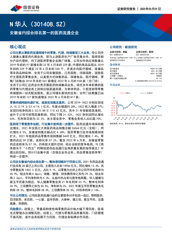 风险提示:政策上,带量采购使终端零售药品价格大幅下滑风险、医保定点管理办法调整风险;经营上,代理与零售药品质量风险、门店管理不善风险、省外业务拓展不力风险、代理业务贴牌合作风险。