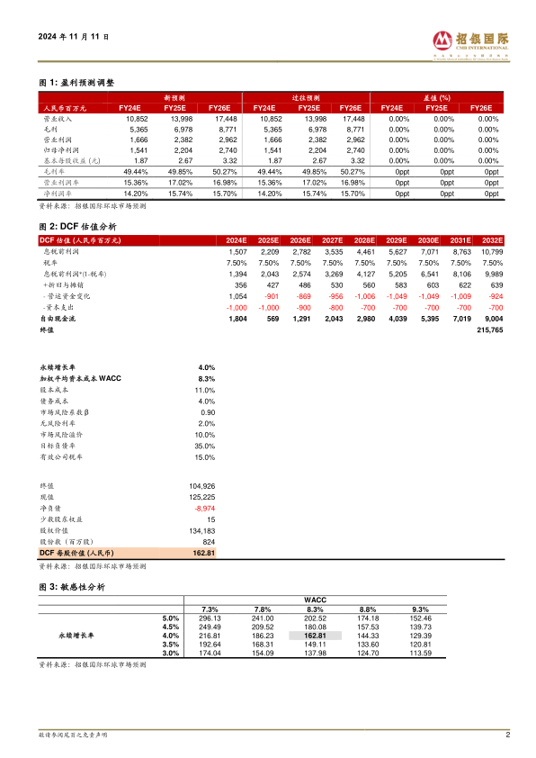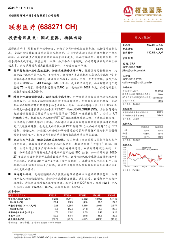 维持买入评级。我们预期国内公立医院招标活动将从四季度开始强势复苏,公司海外收入持续快速增长,看好公司业绩修复弹性。我们认为,公司超声产品线即将推出,为长期业绩增长再添重要动力。基于9年的DCF模型,维持162.81元人民币的目标价(WACC:8.3%,永续增长率:4.0%)。
