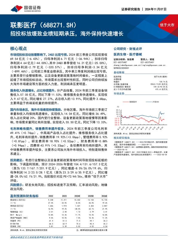 本报告分析了联影医疗2024年前三季度的财务数据和市场表现,指出公司业绩短期承压,但海外市场表现强劲。报告下调了对公司未来营收和利润的预测,但维持“优于大市”评级,并提示了相关风险。总体而言,联影医疗在短期内面临挑战,但长期发展潜力依然存在。