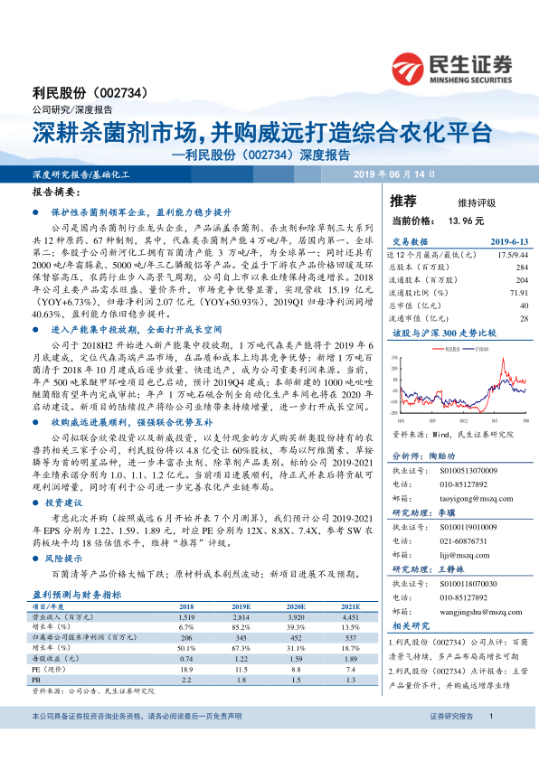 - 估值对比: 2018-2020年可比公司平均PE分别为13、12、9.4倍。利民股份当前估值略低于行业平均水平,并表后可享有估值溢价。当前股价对应PE为12X、8.8X、7.4X。