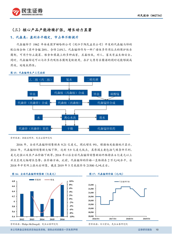 - 产品特性与市场: 代森锰锌是广谱性多作用位点保护性杀菌剂,毒性低,可与多种内吸性杀菌剂复配。2016年全球销售额9.21亿美元,2014年后销售额持续增长。价格在2018年中上涨后回落,2019年5月底报价约21500元/吨。