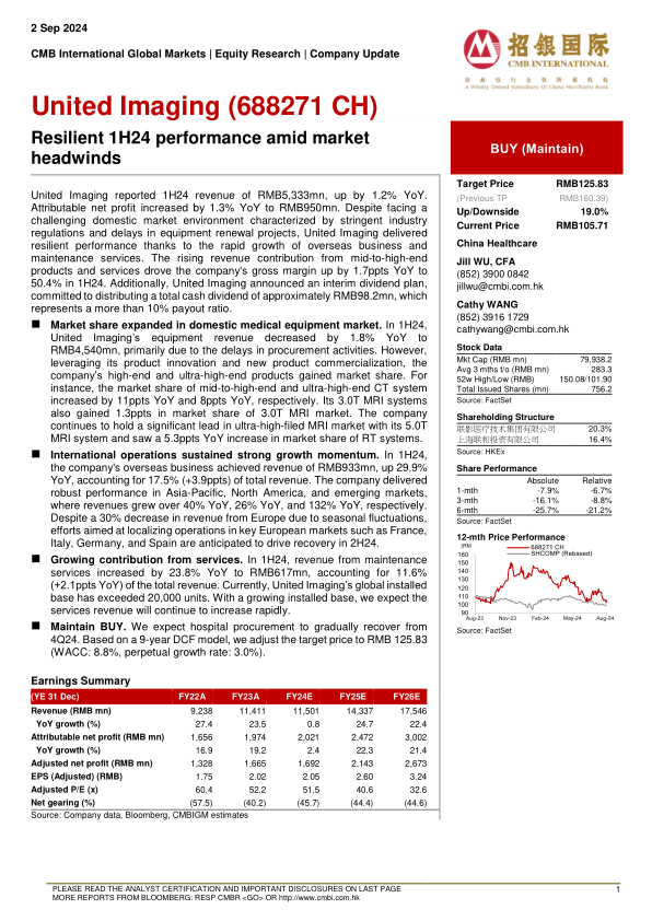 United Imaging reported 1H24 revenue of RMB5,333mn, up by 1.2% YoY.Attributable net profit increased by 1.3% YoY to RMB950mn. Despite facing achallenging domestic market environment characterized by stringent industryregulations and delays in equipment renewal projects, United Imaging deliveredresilient performance thanks to the rapid growth of overseas business andmaintenance services. The rising revenue contribution from mid-to-high-endproducts and services drove the company's gross margin up by 1.7ppts YoY to50.4% in 1H24. Additionally, United Imaging announced an interim dividend plan,committed to distributing a total cash dividend of approximately RMB98.2mn, whichrepresents a more than 10% payout ratio.