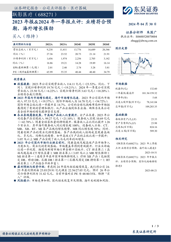 联影医疗在2023年及2024年一季度展现出稳健的业绩增长,尤其在国际市场表现突出,海外收入实现强劲增长,国际市场占比显著提升,验证了公司全球化战略的成功。同时,公司通过持续的产品创新和结构优化,推动中高端产品收入比重提升,巩固了在国内医疗器械市场的领先地位。尽管国内招采恢复存在不确定性导致盈利预测有所调整,但分析师仍维持“买入”评级,表明对公司长期发展前景的信心。未来需关注市场竞争加剧、国内招采恢复不及预期以及海外关税增加等潜在风险。