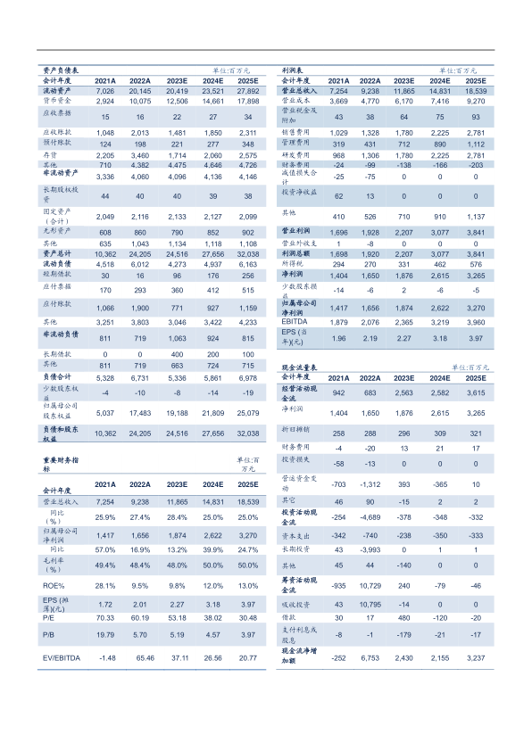 盈利预测与投资评级:预计2023-2025年公司营业收入分别为11865、14831、18539百万元,同比增长28.4%、25.0%、25.0%,EPS分别为2.27、3.18、3.97元,现价对应PE为53、38、30倍。