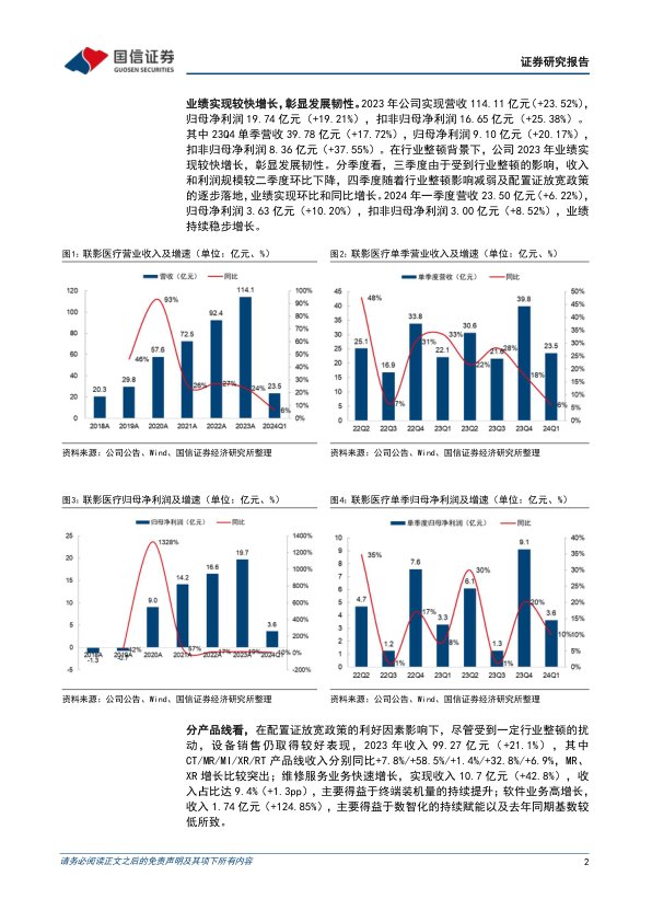 本报告分析了联影医疗2023年及2024年一季度的财务业绩,指出公司在行业整顿背景下依然保持了稳健的增长势头,展现出较强的经营韧性。公司在产品线方面,设备销售稳健增长,维修服务和软件业务表现亮眼;在市场区域方面,国内市场稳步增长,国际市场拓展迅速。同时,公司持续加大研发投入,积极推进技术创新,不断推出高端产品。 报告维持“增持”评级,并对公司未来的营收和利润进行了预测。