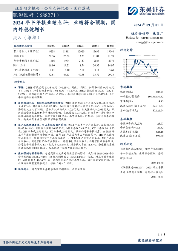 联影医疗2024年半年报业绩符合预期,国内外市场表现稳健,各产品线发展良好,服务收入增长迅速。虽然国内市场短期承压,但海外市场增长强劲,公司整体发展态势良好。考虑到公司技术壁垒高,海外市场空间广阔,维持“买入”评级。同时,报告也提示了国内常规业务销售不及预期和关税等风险。