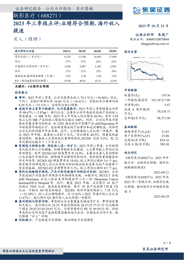 联影医疗2023年三季报显示业绩符合预期,高端产品市场占有率提升,毛利率显著增长。公司持续加大研发投入,管理能力不断加强。国际化战略稳步推进,多款产品在海外顶级医疗机构取得突破,海外收入占比持续提升。