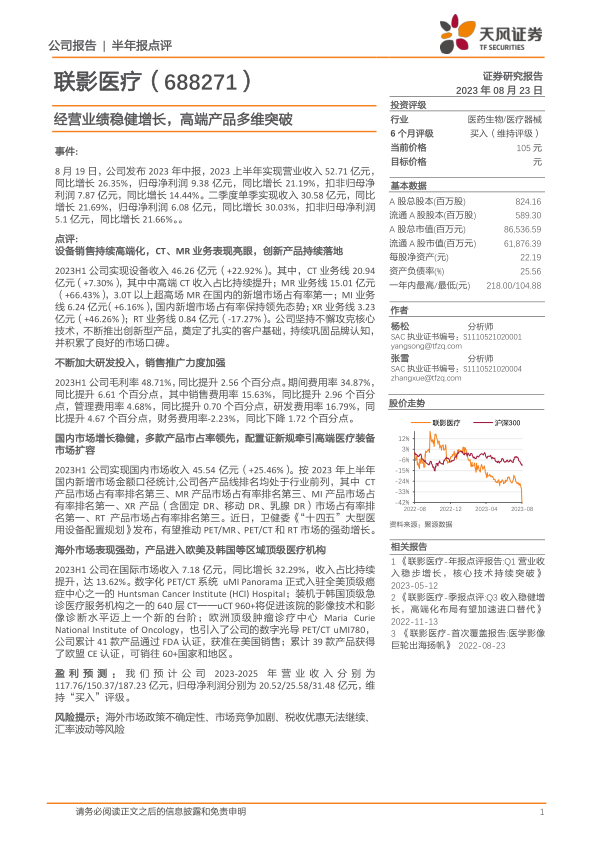 联影医疗2023年上半年业绩表现稳健,高端产品销售亮眼,研发投入和市场拓展力度加大,国内外市场均取得显著进展。公司在CT、MR、MI、XR等多个产品线上均保持领先的市场地位,海外市场拓展也取得重要突破。维持“买入”评级,展望未来,联影医疗有望继续保持快速增长。