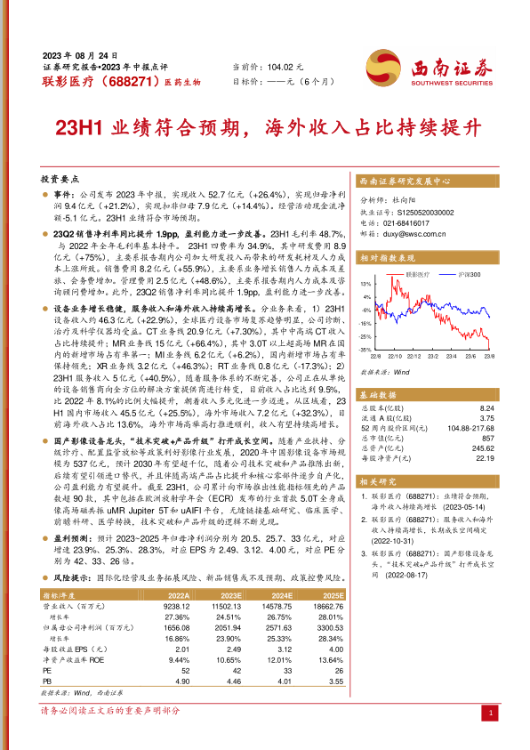 联影医疗在2023年上半年取得了令人瞩目的业绩,营收和归母净利润均实现双位数增长,显示出其强大的市场竞争力和盈利能力。公司通过持续加大研发投入,推动技术突破和产品升级,特别是在高端MR等领域取得了显著的市场领先地位。同时,战略性地拓展服务业务和海外市场,不仅优化了收入结构,也为公司开辟了新的增长点。尽管面临国际化经营、新品销售和政策控费等风险,但凭借其作为国产影像设备龙头的地位、不断创新的产品组合以及广阔的市场前景,联影医疗有望在未来持续保持高速增长,巩固其在医疗影像设备领域的领导地位。