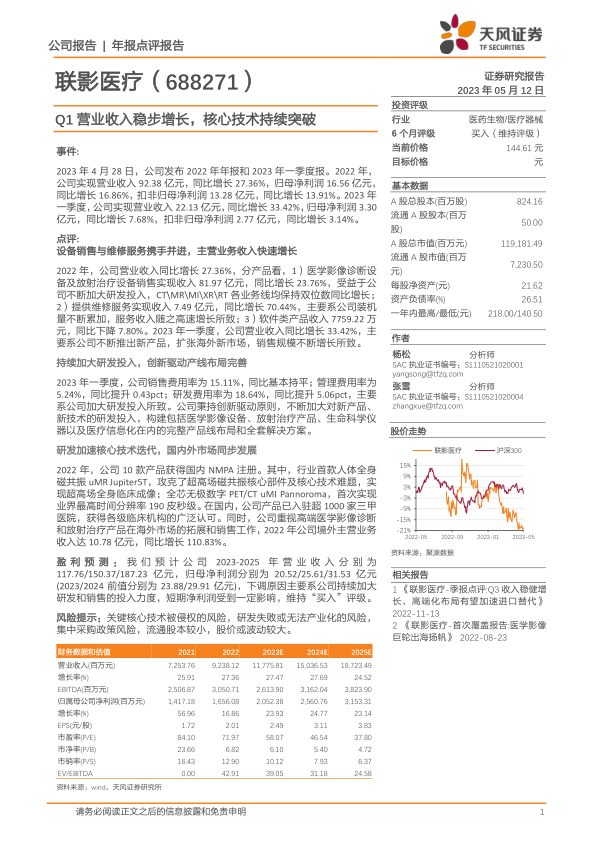 本报告对联影医疗(688271)2022年年报和2023年一季度报进行了分析,核心观点如下: