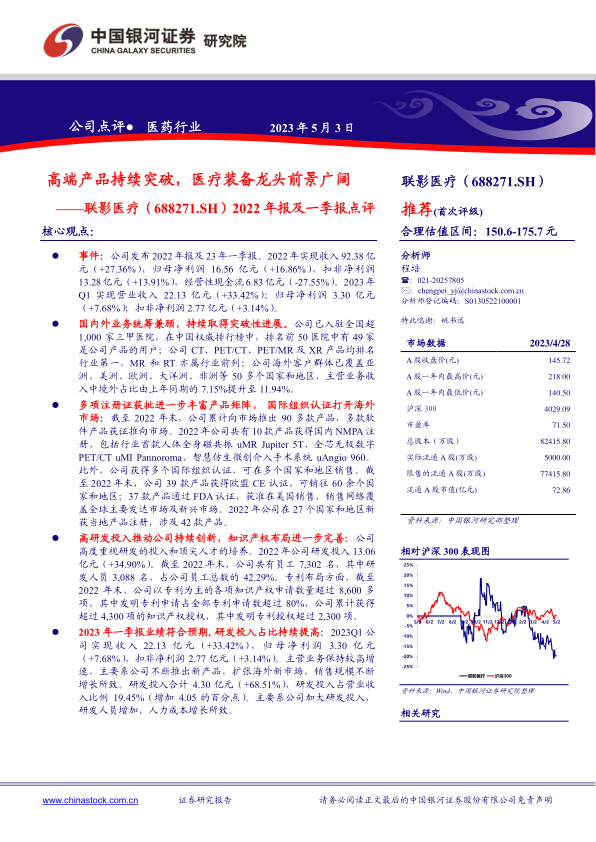 联影医疗在2022年及2023年第一季度实现了营收的稳健增长,尤其在高端医疗影像设备领域持续突破。公司在国内市场占据领先地位,产品广泛覆盖全国超1,000家三甲医院,并在CT、PET/CT、PET/MR及XR等多个产品线中市场占有率排名第一。