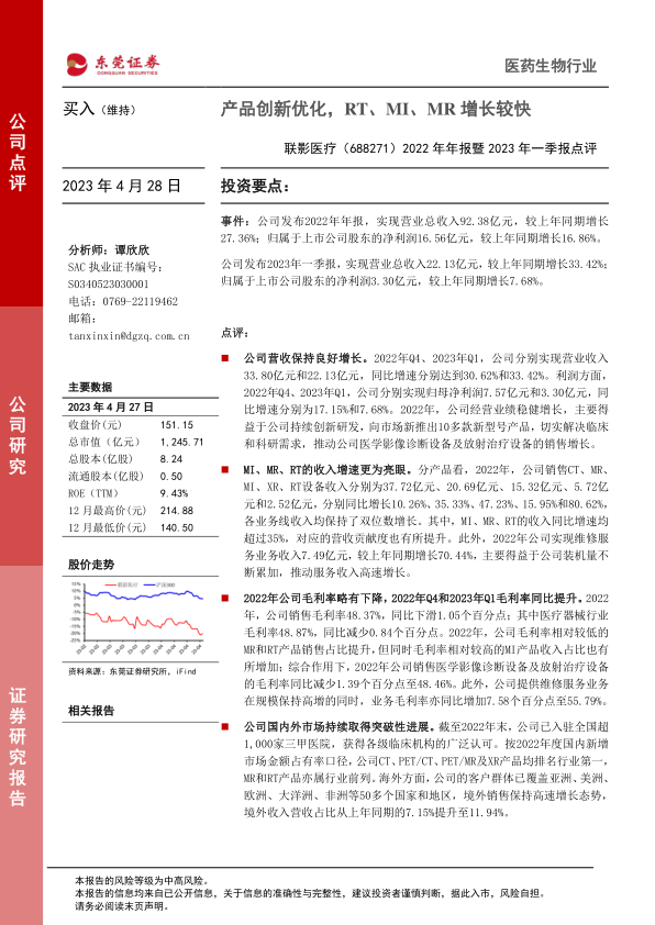 联影医疗2022年年报和2023年一季报显示,公司营收和利润保持良好增长,产品创新和市场拓展是主要驱动力。MI、MR、RT等产品线表现突出,维修服务业务增长迅速。虽然毛利率略有下降,但整体经营状况稳健。维持买入评级,但需关注市场竞争、研发风险等因素。