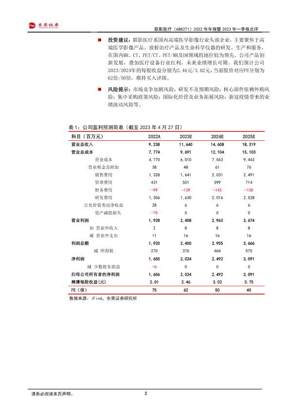 投资建议:联影医疗系国内高端医学影像行业头部企业,主要聚焦于高端医学影像产品、放射治疗产品及生命科学仪器的研发、生产和服务,在国内MR、CT、PET/CT、PET/MR及DR领域的地位较为领先。公司产品创新发展,叠加医疗设备行业红利,未来业绩增长可期。我们预计公司2023/2024年的每股收益分别为2.46元/3.02元,当前股价对应PE分别为62倍/50倍,维持买入评级。