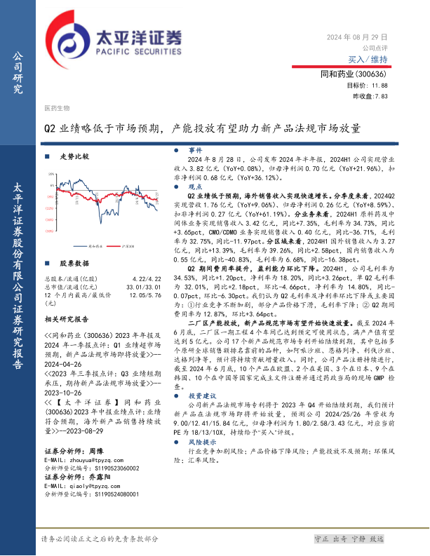 同和药业2024年半年度业绩略低于预期,但受益于二厂区产能释放和新产品法规市场放量,公司未来增长潜力巨大。太平洋证券维持“买入”评级,并提示投资者关注行业竞争、产品价格、产能投放、环保及汇率风险。