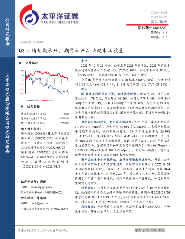 同和药业Q3业绩受到短期因素的影响,营收和利润同比下滑,低于预期。但公司在新产品放量和产能释放的推动下,未来业绩有望实现高速增长。