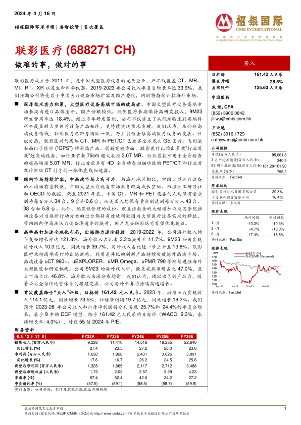 首次覆盖给予“买入”评级,目标价 161.42 元人民币。 2023 年,联影医疗实现收入 114.1 亿元,同比增长 23.5%;归母净利润 19.7 亿元,同比增长 19.2%。 我们预计 2023-26 年公司收入和归母净利润将分别实现 25.7%和 24.4%的年复合增长,基于 9 年的 DCF 模型,给予 161.42 元人民币的目标价(WACC: 9.3%, 永续增长率: 4.0%) ,对应 55 倍 2024 年 P/E